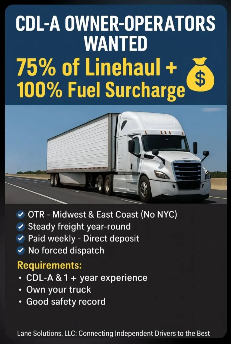 Our priority at Lane Solutions is to match our drivers with carriers that fit their needs. We understand when the time has come for a driver to look for new employment it can be overwhelming receiving all the recruiting emails, texts and calls. Our goal is to find drivers the perfect carrier, and let that one carrier contact you. It is as simple as Filling our Driver Questionnaire to the below and letting us get to work for you!